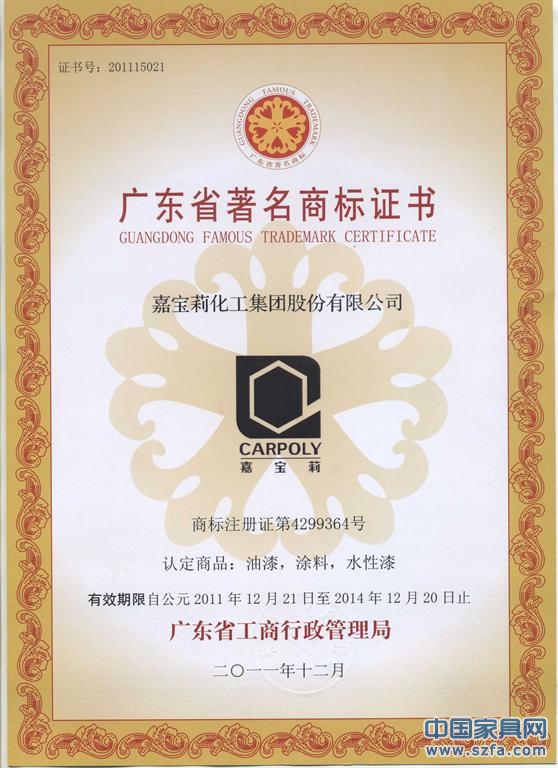 廣東省著名商標證書(油漆、涂料、水性漆)