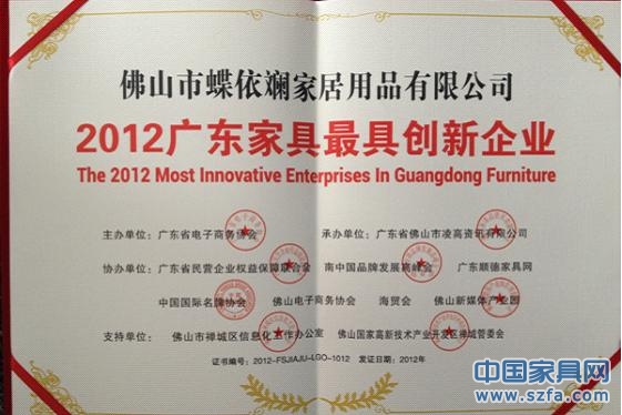 2012年12月28日,由廣東省電子商務協(xié)會舉辦的,廣東家具行業(yè)創(chuàng)新頒獎典禮在佛山舉行。數(shù)百家業(yè)內代表企業(yè)精英齊聚,共襄盛舉。佛山市蝶依斕家居用品有限公司榮獲2012廣東家具最具創(chuàng)新企業(yè)殊榮。