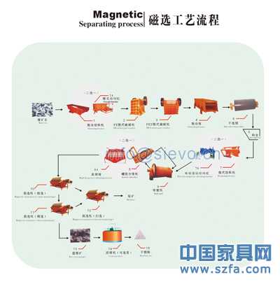 磁鐵礦選礦設備具體生產(chǎn)流程如下: 開采的礦石先由顎式破碎機進行初步破碎,在破碎至合理細度后經(jīng)由提升機、給礦機均勻送入球磨機,由球磨機對礦石進行粉碎、研磨。經(jīng)過球磨機研磨的礦石細料進入下一道工序—分級。螺旋分級機借助固體顆粒的比重不同而在液體中沉淀的速度不同的原理,對礦石混合物進行洗凈和分級。經(jīng)過洗凈和分級的礦物混合料在經(jīng)過磁選機時,由于各種礦物的比磁化系數(shù)不同,經(jīng)由磁力和機械力將混合料中的磁性物質分離開來。 經(jīng)過磁選機初步分離后的礦物顆粒在被送入浮選機,根據(jù)不同的礦物特性加入不同的藥物,使得所要的礦物質與其他物質分離開。在所要的礦物質被分離出來后,因其含有大量水分,須經(jīng)濃縮機的初步濃縮,再經(jīng)烘干機烘干,即可得到干燥的礦物質。