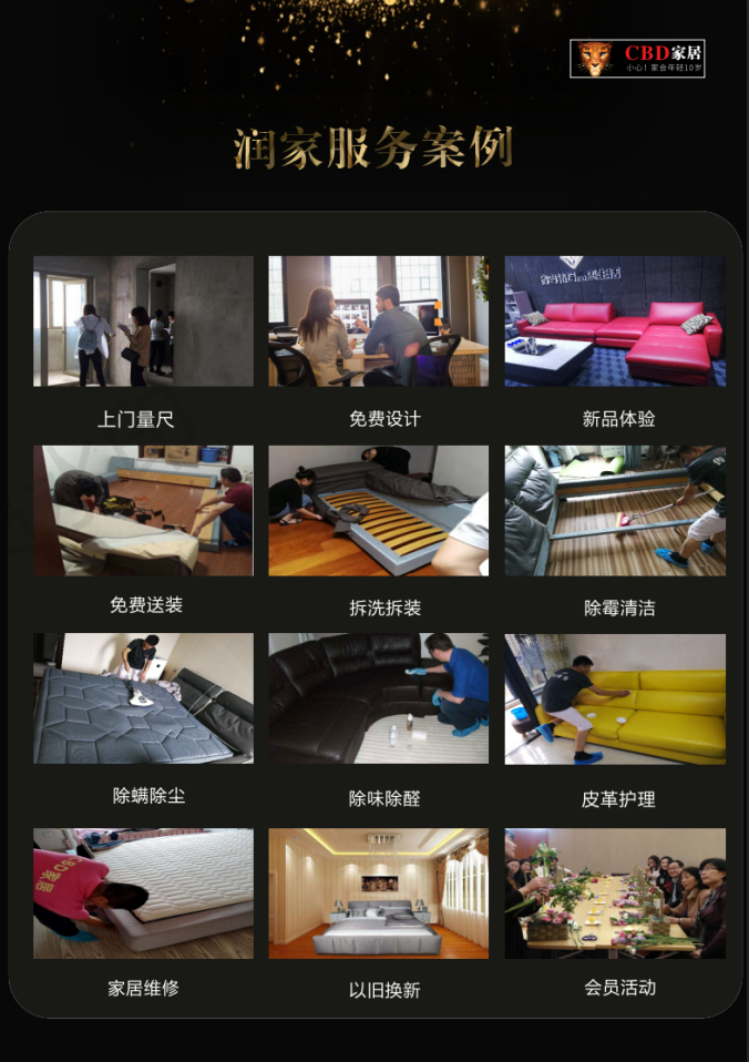 高素質(zhì)專業(yè)化的服務(wù)團(tuán)隊(duì),秉承“便捷、快速、真誠、專業(yè)”的服務(wù)理念,提供從單品選購到全屋搭配布局的咨詢答疑,解決您的款式選擇和整裝定制的困擾;全面落實(shí)運(yùn)輸安裝、拆洗拆裝、產(chǎn)品護(hù)理、家具維修等服務(wù);定期開展回訪與節(jié)日問候,神秘禮物相送,讓您感受到CBD家居的專業(yè)與貼心。