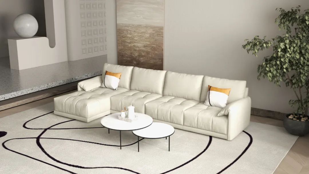 愛馬仕橙為空間注入活力,靠包條紋+拉點(diǎn)組合點(diǎn)綴,精致工藝演繹時(shí)尚新風(fēng)尚,飽滿內(nèi)里填充,得沙發(fā)級(jí)舒適靠感。