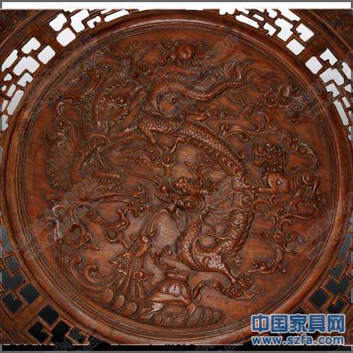 該地鏡、屏風(fēng)采用上等緬甸花梨木制成,屏心與臺架為分體式。圓形屏心采用同心圓設(shè)計。外圓邊緣雕飾如意紋,內(nèi)圓與外圓透雕拐子紋相接,內(nèi)圓中心飾龍鳳呈祥圖。圖案為一龍一鳳,古人認(rèn)為,龍為百獸之王,鳳為百鳥之王。龍鳳出現(xiàn),天下就會祥和太平,百業(yè)興旺,五谷豐登,百姓就能安居樂業(yè),幸福美滿。千百年來,龍鳳就是人們心目中的吉祥之物,是中華民族吉祥和平的象征。站牙透雕立龍,立體感強(qiáng),盡顯威武之態(tài)。