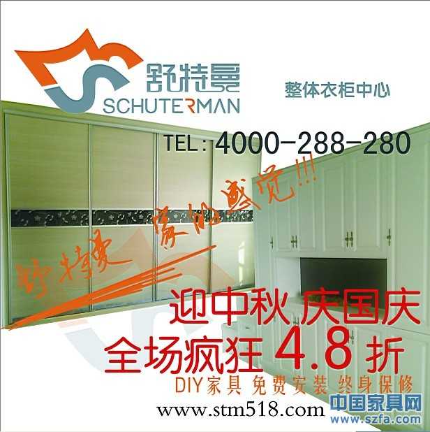 迎中秋舒特曼整體衣柜,鞋柜、書柜、電視柜等家具特價(jià)大回饋,全場(chǎng)4.8折。