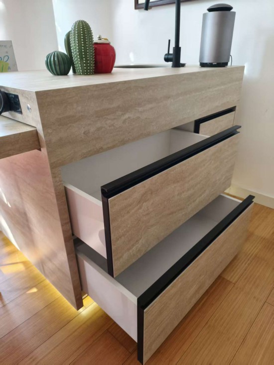 The bottom layered design hides a storage trick: buffer drawers for tableware and open compartments for small appliances, etc. The side can be embedded with magnetic knife racks and condiment pull-out baskets, keeping the countertop always clean and orderly. Factory direct sales quality, supports size and function customization, free delivery and installation services, no worries when using.