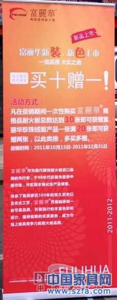 針對(duì)本次新裝、新色上市活動(dòng),富麗華還推出了優(yōu)惠活動(dòng),在促銷期間(2011年10月15日--2011年12月31日),凡一次性購買富麗華規(guī)格品耐火板總數(shù)達(dá)到10張,即可獲贈(zèng)富麗華珍珠絨面產(chǎn)品1張。促銷活動(dòng)詳情敬請(qǐng)咨詢?nèi)珖鞯馗畸惾A高級(jí)裝飾耐火板經(jīng)銷商