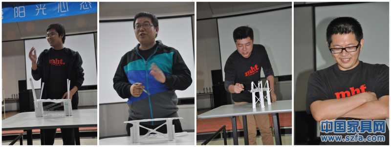 游戲規(guī)則:團(tuán)隊(duì)成員利用一定資源的A4紙和工具,扎造出一座美國(guó)舊金山的金門大橋,橋面寬度為易拉罐可樂高度,橋面高度為啤酒易拉罐高度,最后以承重易拉罐裝可樂的數(shù)量最多的團(tuán)隊(duì)為優(yōu)勝團(tuán)隊(duì)。
