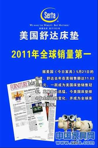 根據(jù)美國《今日家具》5月21日報道,舒達床墊在美國2011年銷售額達11.63億美金,榮膺全球銷售冠軍,一躍成為全球銷售第一床墊品牌,增幅達到18.1%,發(fā)展勢頭迅猛,令全球床墊排名發(fā)生歷史性變化。