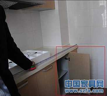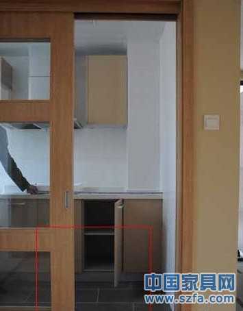 在現(xiàn)場(chǎng)記者發(fā)現(xiàn),廚房一進(jìn)門放置冰箱的位置,長(zhǎng)寬都不超過100CM,如果按照設(shè)計(jì)圖紙?jiān)趶N房門口擺放一臺(tái)電冰箱,冰箱左側(cè)的櫥柜門,打開就要被冰箱阻擋。同樣冰箱右側(cè)的半扇廚房門也要受到阻擋。“現(xiàn)在市場(chǎng)上,基本找不到寬度小于40CM的小冰箱,買個(gè)對(duì)開門的大冰箱,完全放不進(jìn)廚房。”王先生稱。