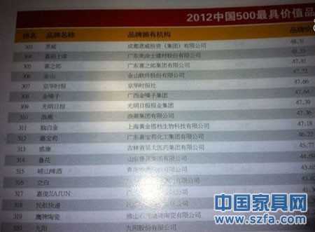 2012中國(guó)500強(qiáng)榜單,嘉麗士位居304名,品牌價(jià)值48.25億