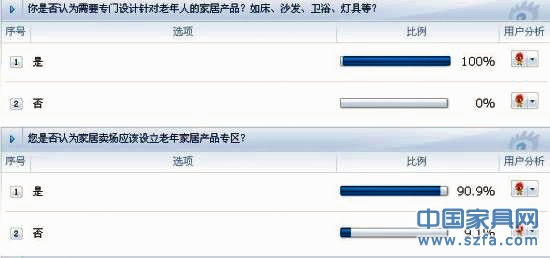 重陽節(jié)前夕,新浪家居聯(lián)合參考消息北京參考做了一份有關(guān)老年家居市場(chǎng)調(diào)查的網(wǎng)絡(luò)調(diào)查。其中一項(xiàng)關(guān)于“你是否認(rèn)為需要專門設(shè)計(jì)針對(duì)老年人的家居產(chǎn)品?如床、沙發(fā)、衛(wèi)浴、燈具等”的調(diào)查中,100﹪的網(wǎng)友表示需要。在另一項(xiàng)關(guān)于家居賣場(chǎng)是否該設(shè)立老年家居產(chǎn)品專區(qū)的調(diào)查中,90.9﹪的網(wǎng)友選擇了是??梢姡夏昙揖影ɡ夏昙揖咴趦?nèi)的消費(fèi)訴求很高。 新浪家居聯(lián)合參考消息北京參考有關(guān)老年家居市場(chǎng)調(diào)查部分調(diào)查結(jié)果