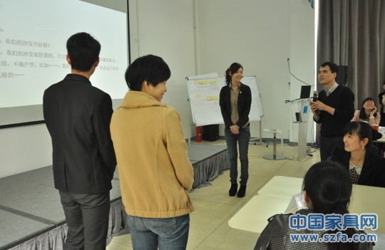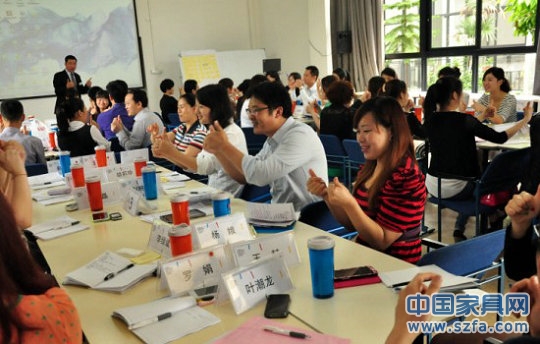 高老師快樂授課,圖為在講解家居顧問的八個(gè)流程訓(xùn)練:迎客、接觸、產(chǎn)品介紹、引導(dǎo)顧客感受產(chǎn)品、開顧客的心門、處理反對(duì)意見、成交動(dòng)作、留客。