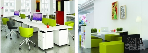 這款辦公家具的設(shè)計(jì)造型已經(jīng)申請(qǐng)專利,桌沿以流水線條的形式引導(dǎo)使用者側(cè)身而坐,使并排而坐的工作者之間也能擁有相對(duì)私密性。沒有采用傳統(tǒng)的落地屏風(fēng)作為間隔,只是在桌面上以輕快的果綠色亞克力材料或綠色植物稍作隔板,營(yíng)造開放、活潑、高效溝通的辦公氛圍。同款樂樂休閑沙發(fā)套件由多個(gè)單件組合而成,可根據(jù)整體空間的尺寸、個(gè)人喜好、功能需求等對(duì)模塊進(jìn)行移動(dòng)組合,多變的造型能適應(yīng)多種場(chǎng)合需求。