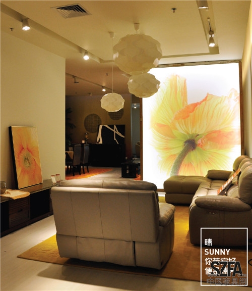 這是一個關(guān)于一位內(nèi)心陽光,對藝術(shù)無限追求的才情女子的故事。以陽光黃為主基調(diào),燈箱隔斷中綻放的花朵顯得更加燦爛奪目。枝形吊燈是自然界樹枝的抽象表達,端頭的球形燈泡仿若累累的碩果。整個空間都散發(fā)出無限的正能量。