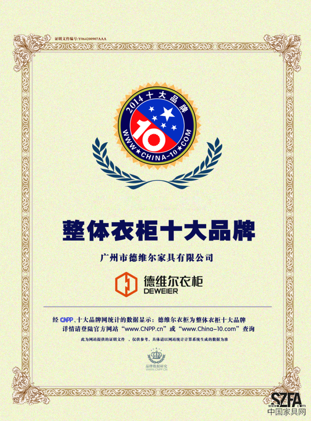 作為中國工商聯(lián)衣柜協(xié)會副會長單位的德維爾,通過ISO9001質(zhì)量管理體系認(rèn)證,曾獲“最有潛力衣柜品牌”、“最佳品牌建設(shè)獎(jiǎng)”、“中國環(huán)境標(biāo)志產(chǎn)品認(rèn)證產(chǎn)品”、“廣東省守合同重信用企業(yè)”、“誠信•質(zhì)量標(biāo)桿企業(yè)”、“‘質(zhì)量•服務(wù)'雙十強(qiáng)示范企業(yè)”、“整體衣柜十大品牌”、“中國整體家居聯(lián)盟主席單位”、“中國著名品牌”、“綠色環(huán)保產(chǎn)品”、“3A級服務(wù)單位”等多項(xiàng)榮譽(yù),并多次榮膺“整體衣柜十大品牌”,最近由中國整體衣柜行業(yè)知名網(wǎng)站——中華衣柜網(wǎng)主辦的第三屆“2014中國整體衣柜十大品牌”網(wǎng)絡(luò)評選結(jié)果正式公布,德維爾衣柜赫然在列。