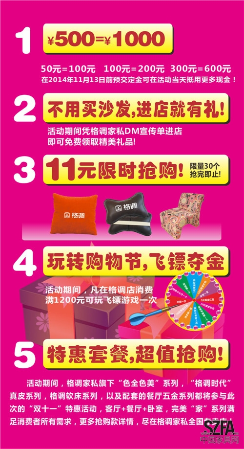 深圳格調(diào)家私成立于2000年,14年的時光,先后獲得“消費(fèi)者最喜愛品牌”、“系列沙發(fā)銷量排名第一”、“中國綠色環(huán)保產(chǎn)品”、“中國布藝沙發(fā)領(lǐng)軍品牌”等諸多榮譽(yù),是消費(fèi)者購買家具的首選品牌!這個雙十一,關(guān)注格調(diào)家私官方微信,即可參與雙十一微信分享贏好禮活動!還等什么?!
