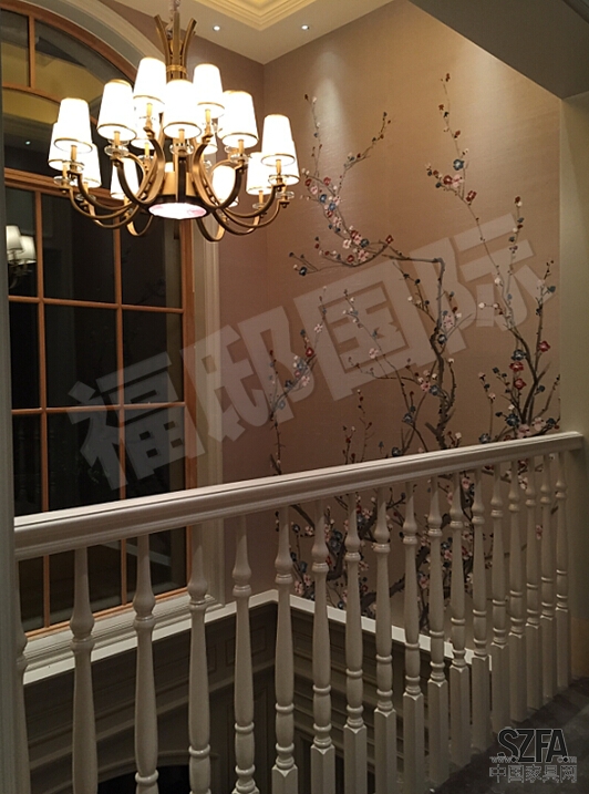 全屋的亮點(diǎn)之一,是福邸的設(shè)計(jì)師用東方元素的手繪墻紙取代傳統(tǒng)的畫飾來裝點(diǎn)餐廳、 樓梯間和玄關(guān)。尤其是玄關(guān),通過鏡子形成對景,從視覺上提升了空間的整體感,可以說是匠心獨(dú)運(yùn),不落俗套。