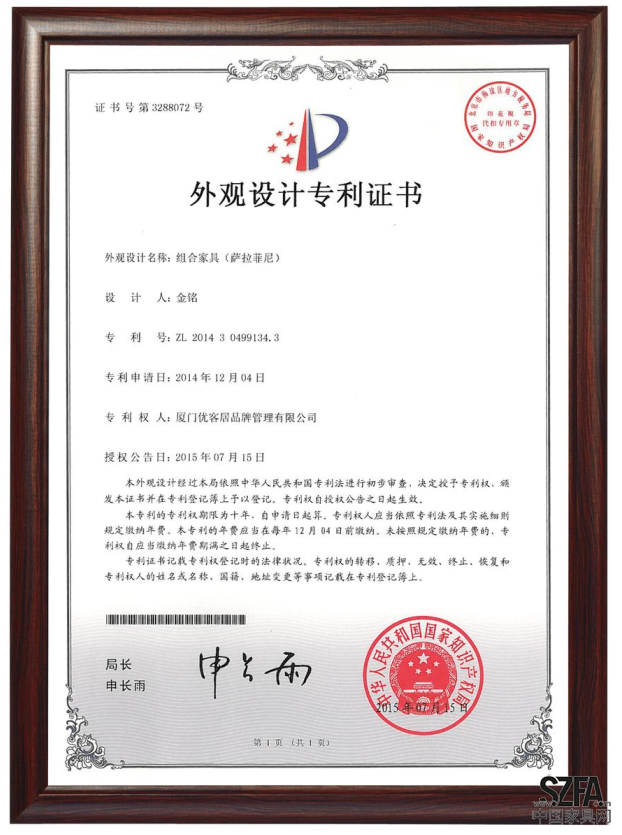 核心提示:2015年7月15日,優(yōu)客居旗下品牌喜夢(mèng)寶和Kids&Teen設(shè)計(jì)的兩款組合家具M(jìn)CQEEN(薩拉菲尼)以及馬拉松系列正式獲得由國(guó)家知識(shí)產(chǎn)權(quán)局頒發(fā)的專利證書。這不僅僅肯定了喜夢(mèng)寶兒童家具以及K&T在設(shè)計(jì)組合中的新穎創(chuàng)意,更是喜夢(mèng)寶與K&T在設(shè)計(jì)上走向成熟的里程碑。