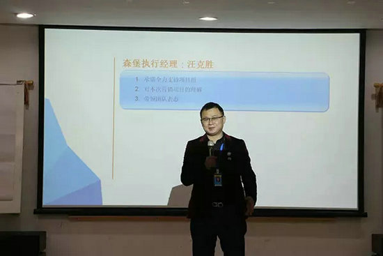 松堡王國執(zhí)行經(jīng)理汪克勝承諾全力支持項(xiàng)目組,對本次營銷項(xiàng)目的理解,并帶領(lǐng)團(tuán)隊(duì)表態(tài)。