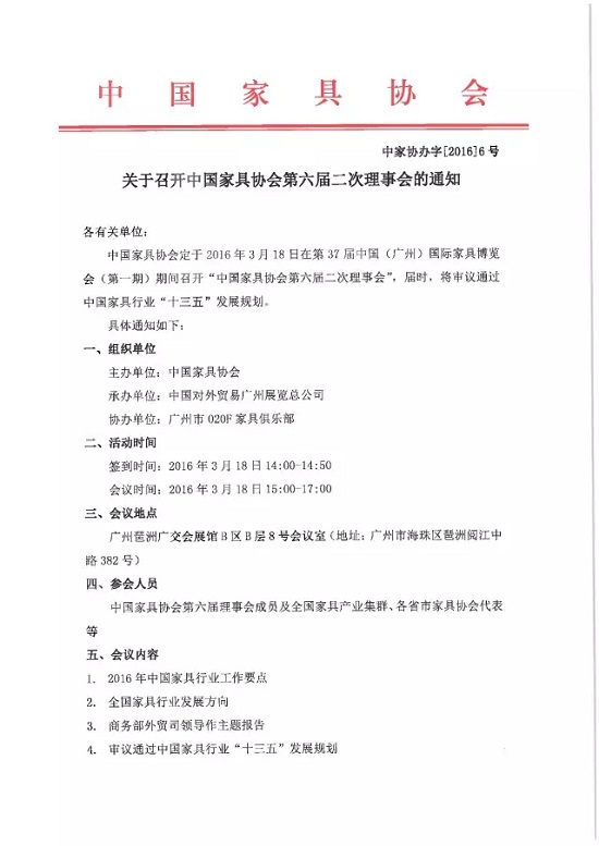 核心提示:中國家具協(xié)會(huì)定于2016年3月18日即第37屆中國(廣州)國際家具博覽會(huì)(第一期)期間在廣交會(huì)展館8號(hào)會(huì)議室隆重召開“中國家具協(xié)會(huì)第六屆二次理事會(huì)”。