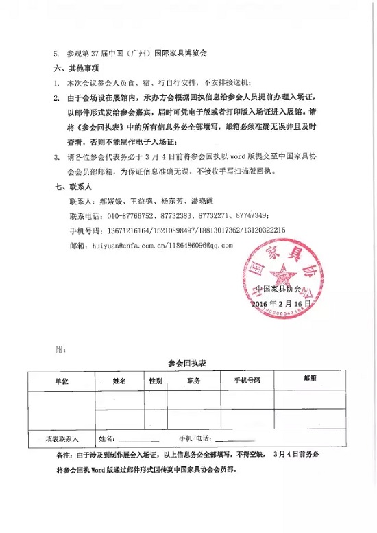 中國家具協(xié)會(huì)定于2016年3月18日即第37屆中國(廣州)國際家具博覽會(huì)(第一期)期間在廣交會(huì)展館8號(hào)會(huì)議室隆重召開“中國家具協(xié)會(huì)第六屆二次理事會(huì)”。屆時(shí),會(huì)議將審議通過中國家具行業(yè)“十三五”發(fā)展規(guī)劃。中國家具協(xié)會(huì)第六屆理事會(huì)成員及全國家具產(chǎn)業(yè)集群、各省市家具協(xié)會(huì)代表等將出席會(huì)議。