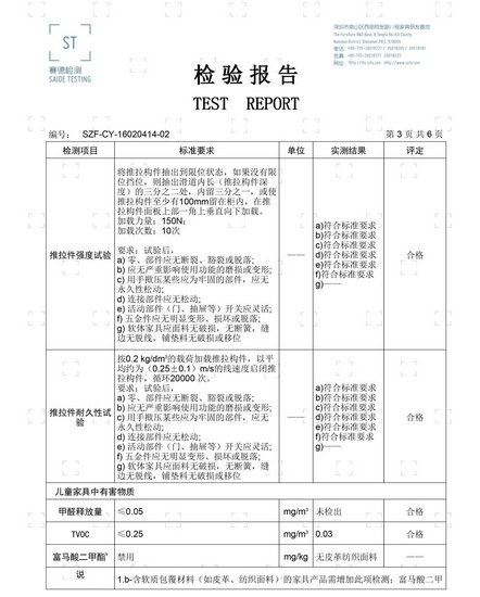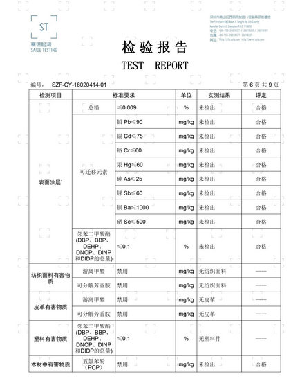 2016年1月,為首批“中國(guó)綠色家具優(yōu)品”獲證企業(yè),賽德檢測(cè)對(duì)松堡王國(guó)進(jìn)行新一年度的質(zhì)量抽檢,此次共抽樣單層床、床頭柜、彎角升降椅三款成品,從常規(guī)性能和環(huán)保性能兩方面進(jìn)行全面的質(zhì)量檢測(cè),抽檢結(jié)果顯示合格率達(dá)到100%。