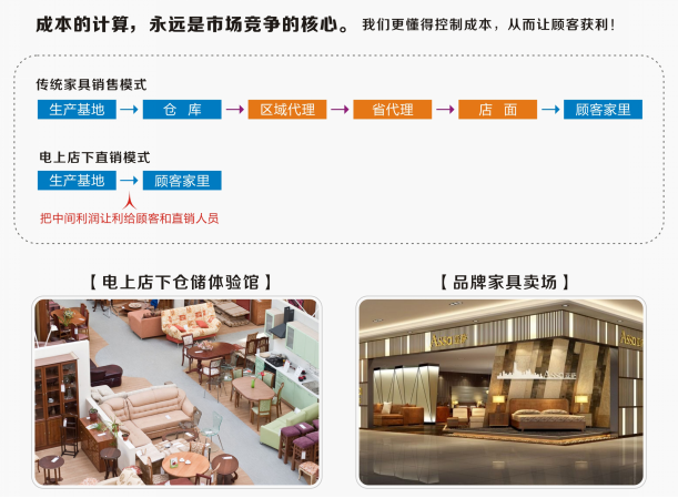 傳統(tǒng)家具銷售模式往往要?dú)v經(jīng)多個(gè)環(huán)節(jié),即生產(chǎn)基地——倉(cāng)庫(kù)——區(qū)域代理——省代理——店面——顧客家里。而在“電上店下”平臺(tái),環(huán)節(jié)則縮減到了兩步,即生產(chǎn)基地——顧客家里。當(dāng)環(huán)節(jié)被省略,經(jīng)銷商便賺到了中間差利潤(rùn),而消費(fèi)者則省去了不必要的購(gòu)物成本。由此可見(jiàn),F(xiàn)BC模式是符合當(dāng)下市場(chǎng)需求的,在人工、運(yùn)營(yíng)、土地租金等成本上擁有很大的優(yōu)勢(shì)。我不趕電商潮,等得就是這樣一個(gè)機(jī)會(huì)。