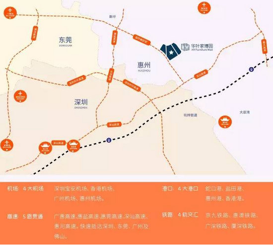 華葉家博園坐落深惠雙城中軸線上,交通便利,連通四大機場:深圳寶安機場、香港機場、廣州白云機場、惠州機場;四大港口:蛇口港、鹽田港、惠州港、香港港;四大軌道交通樞紐:京九鐵路、惠澳鐵路、廣深鐵路、廈深鐵路;以及五大高速貫通:廣惠高速、惠鹽高速、惠莞高速、深汕高速、惠河高速??焖俚诌_深圳、東莞、廣州及佛山等家具產(chǎn)業(yè)重要區(qū)域。
