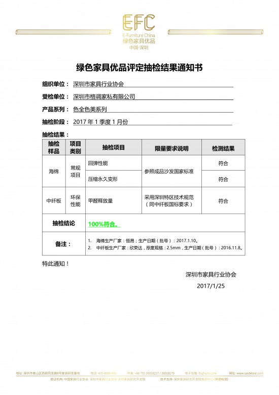 1月25日,深圳市家具行業(yè)協(xié)會(huì)檢測(cè)中心(賽德檢測(cè))針對(duì)“中國綠色家具優(yōu)品”第二批獲證企業(yè)——格調(diào)家私的1月份抽檢工作宣告結(jié)束,格調(diào)家私以100%合格率的結(jié)果取得2017年品質(zhì)長(zhǎng)效監(jiān)督戰(zhàn)的開門紅。