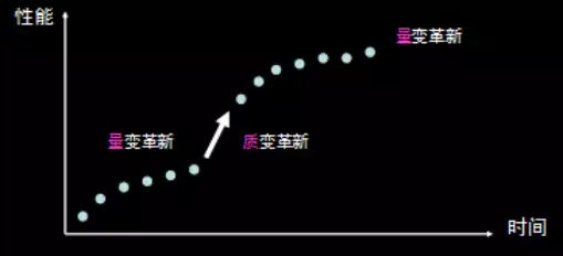 革新按照其性能變化的激烈程度而言,有量變革新與質(zhì)變革新,質(zhì)變革新通常是在量變到一定程度后的跳躍,而不是說變就變的,圖1為量變與質(zhì)變在性能與時間上的關(guān)系函數(shù),這是技術(shù)驅(qū)動革新可遵循的基本規(guī)律。