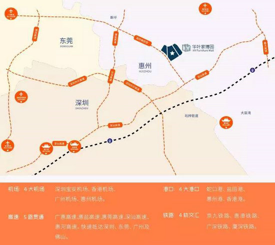 同時,“深莞惠一體化”戰(zhàn)略下,豐富的交通網絡加速建設。深圳外環(huán)貫穿華葉家博園,新深惠快線直通深圳,周邊有廣惠高速、惠鹽高速、惠莞高速、深汕高速、惠河高速五條高速。未來深圳地鐵14號線、16號線將會直通惠陽。另外,華葉家博園還連接惠州機場、惠州港等交通樞紐,打造四維立體交通網,將成為深惠家具乃至中國家具高速發(fā)展的血脈。