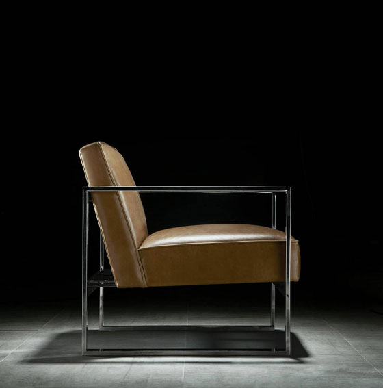 Alum休閑椅的設(shè)計師將金屬與進(jìn)口頭層牛皮碰撞、不銹鋼的幾何直線條與進(jìn)口牛皮軟包形成冷硬與溫柔的對比,獨特且耐人尋味。