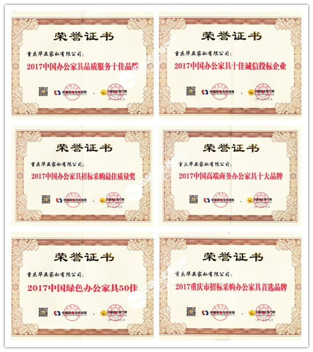 為檢驗(yàn)公司市場(chǎng)競(jìng)爭(zhēng)力,為政府機(jī)構(gòu)、項(xiàng)目業(yè)主在招投標(biāo)方面提供更具針對(duì)性的服務(wù),華亞家私每年都會(huì)參加中國(guó)采購(gòu)與招標(biāo)網(wǎng)、中國(guó)名企排行網(wǎng)聯(lián)合舉辦的辦公家具招標(biāo)采購(gòu)評(píng)價(jià)推介活動(dòng)。在“2017第九屆中國(guó)辦公家具招標(biāo)采購(gòu)評(píng)價(jià)推介活動(dòng)”中,通過對(duì)企業(yè)銷售額、總資產(chǎn)、稅后利潤(rùn)、中標(biāo)金額、注冊(cè)資金、經(jīng)營(yíng)年限等10余項(xiàng)數(shù)據(jù)的核對(duì)、分析、對(duì)比,經(jīng)過專家的綜合評(píng)審,最終獲得“中國(guó)高端商務(wù)辦公家具十大品牌”、“中國(guó)辦公家具十佳誠(chéng)信投標(biāo)企業(yè)”、“中國(guó)辦公家具品質(zhì)服務(wù)十佳品牌”、“中國(guó)綠色辦公家具50佳”、“中國(guó)辦公家具招標(biāo)采購(gòu)最 佳質(zhì)量獎(jiǎng)”、“重慶市招標(biāo)采購(gòu)辦公家具首選品牌”。這是華亞家私24年如一日建立起來的成果,以大數(shù)據(jù)為依托的評(píng)價(jià),是對(duì)華亞家私最公正的評(píng)價(jià)。
