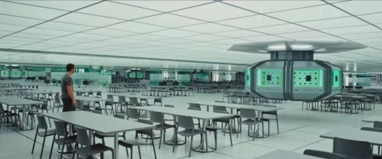 公共“食堂”用以薄荷綠和淺灰來(lái)點(diǎn)綴整體純凈的白色基調(diào),自助選餐和取餐的機(jī)器從倒置在天花板上。這里看似共享卻也有明顯的等級(jí)之分,例如身價(jià)不夠的乘客可以選擇的食品種類就很單一。