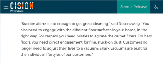 Shark創(chuàng)始人Mark Rosenzweig在此前的采訪中表示:不應(yīng)是消費(fèi)者改變生活習(xí)慣去適應(yīng)吸塵器,因?yàn)镾hark吸塵器就是為適合消費(fèi)者而設(shè)計(jì)的。這也是Mark Rosenzweig創(chuàng)立品牌的初衷——把用戶體驗(yàn)放在第一位。shark希望通過美式構(gòu)思為中國消費(fèi)者創(chuàng)造更優(yōu)質(zhì)的清潔體驗(yàn)。