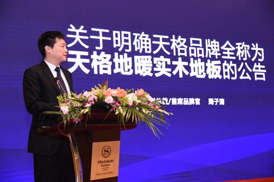 作為倡議方,以及地采暖用實木地板品類發(fā)明者和領導品牌,天格首先響應倡議,由副總裁兼首席品牌官周子清宣讀《關于明確天格品牌全稱的公告》,率先將天格品牌全稱確定為“天格地暖實木地板”。