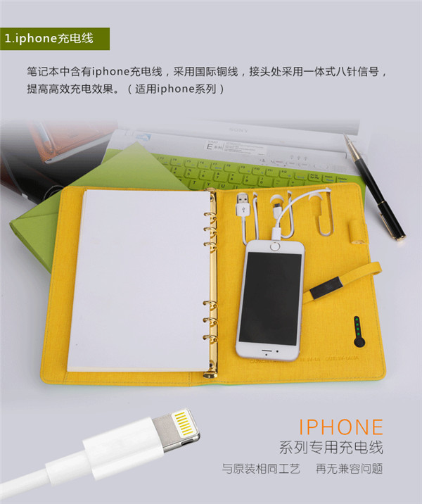 現(xiàn)代人的生活離不開(kāi)電子產(chǎn)品,但是工作的繁忙讓人無(wú)暇充電。深圳市普萊奧實(shí)業(yè)有限公司貼心設(shè)計(jì)充電記事本,配備金屬磁搭扣,內(nèi)置移動(dòng)電源,支持蘋(píng)果安卓手機(jī)一線兩充,更有4個(gè)卡槽和一個(gè)文件袋設(shè)計(jì),配備80張活頁(yè)特級(jí)道林書(shū)寫(xiě)紙芯,滿足工作需要,再也不必?fù)?dān)心錯(cuò)過(guò)重要消息。如此實(shí)用的禮物,男女皆宜,你不考慮一下嗎?