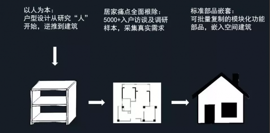 USIZE(優(yōu)舍住宅產(chǎn)業(yè)科技)基于精裝院的逆推式邏輯,即部品——室內(nèi)——建筑,以消費者居家需求為設(shè)計原點,按工業(yè)模數(shù)換算出標(biāo)準(zhǔn)功能模塊,確定收納部品尺寸,組合成標(biāo)準(zhǔn)功能空間,根據(jù)動線最優(yōu)原理連接空間成戶型,推導(dǎo)出建筑圖紙,并最終落地實施。