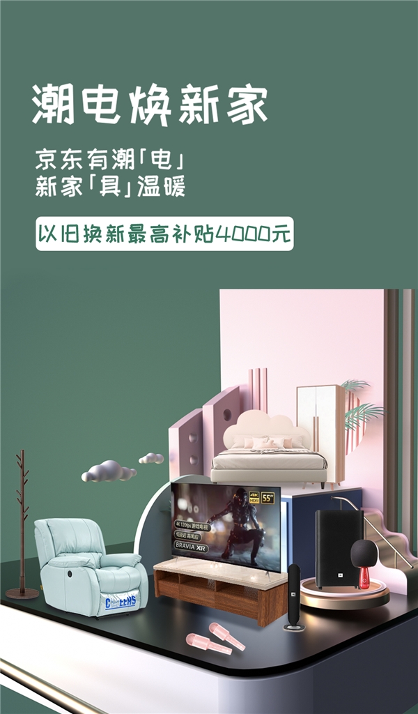 為了讓家中電視影音和家具配得上你的新家,4月15日-4月20日,京東電視影音聯(lián)合京東家具,發(fā)起“潮電煥新家”活動,頭號京貼每滿300減30,跨品類煥新補(bǔ)貼800元,以舊換新最高補(bǔ)貼4000元,通過巨額補(bǔ)貼和創(chuàng)意內(nèi)容,不僅致力于為消費(fèi)者提供更多的家裝煥新的產(chǎn)品選擇,也希望借此將“京東有潮「電」,新家「具」溫暖”的活動理念傳達(dá)給消費(fèi)者。