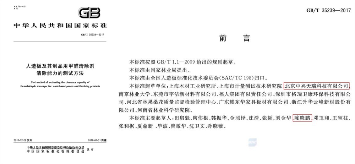 治理人造板的甲醛污染,一定要選用“人造板及其制品用甲醛清除劑”(簡稱“人造板甲醛清除劑”)。針對人造板甲醛清除劑,我國制定有國家標準《人造板用甲醛清除劑清除能力的測試方法》GB/T35239—2017,來檢驗人造板甲醛清除劑的除醛效果。