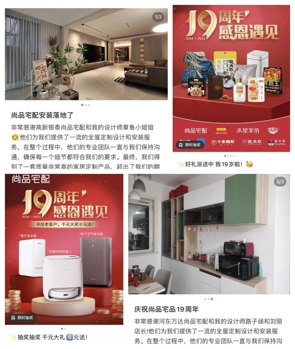 在社交媒體平臺,尚品宅配在6月18日當(dāng)天攜手中國聯(lián)通、創(chuàng)米小白、燕之屋等19個品牌,共同發(fā)起周年慶跨界互動與粉絲營銷,打造多張品牌聯(lián)合慶生海報(bào),通過轉(zhuǎn)發(fā)抽獎、熱搜話題等,將品牌熱度推向新高。截止目前,#尚品宅配19有愛、#19周年我和尚品宅配的故事等話題閱讀量累計(jì)超千萬,超千位用戶參與分享或發(fā)布周年慶相關(guān)內(nèi)容。小紅書也發(fā)起#19周年我和尚品宅配的故事#征集活動,抽獎送千元大禮。