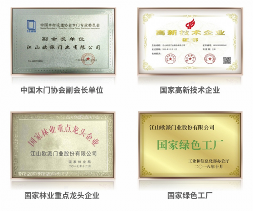 江山歐派門業(yè)股份有限公司是一家集研發(fā)、生產銷售、服務于一體的專業(yè)制門企業(yè)(2017年2月10日上以兼具品價比的產品競爭力和市場影響力獲得了消費者及客戶的一致好評,獲得了中國木門協(xié)會副會長單位、國家高新技術企業(yè)、國家林業(yè)重點龍頭企業(yè)、國家綠色工廠等榮譽和稱號。2008年,江山歐派在第19類非金屬門”等商品上注冊了“歐派”商標。該商標經(jīng)過持續(xù)多年的使用,已被社會公眾廣泛認知,形成較高的品牌知名度及美譽度。