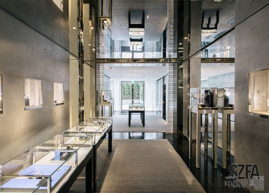Peter Marino 負(fù)責(zé)室內(nèi)設(shè)計,單色沉穩(wěn)的地板設(shè)計,光潔的鏡面背景墻飾,纖維織物展示架,無不透露著高大尚的氣息。片狀的玻璃墻鑲嵌于建筑立面之間,使室內(nèi)獲得自然采光,奢華且具光澤感的設(shè)計與室內(nèi)陳設(shè)品和當(dāng)代藝術(shù)作品相得益彰,甚至店內(nèi)的玻璃休閑座椅也是出于著名日本設(shè)計師Nendo之手。