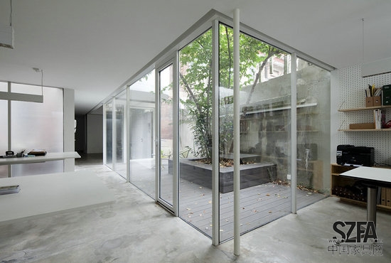 然后,我們想以庭院里的老樹作為中心,布局時(shí)把常用的會(huì)議室與辦公室空間圍繞著她 。透過三面落地玻璃窗,辦公室中無處不以臘梅樹作為背景。