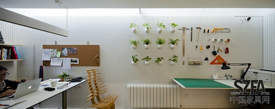 為了保持桌面整整有條,電線托盤裝置被我們優(yōu)化成為雙層系統(tǒng);底層是電線槽,頂層是擺放文具的蓋盆。多功能的概念伸延到白色多孔板墻面,靈活的系統(tǒng)鼓勵(lì)大家發(fā)揮創(chuàng)意。
