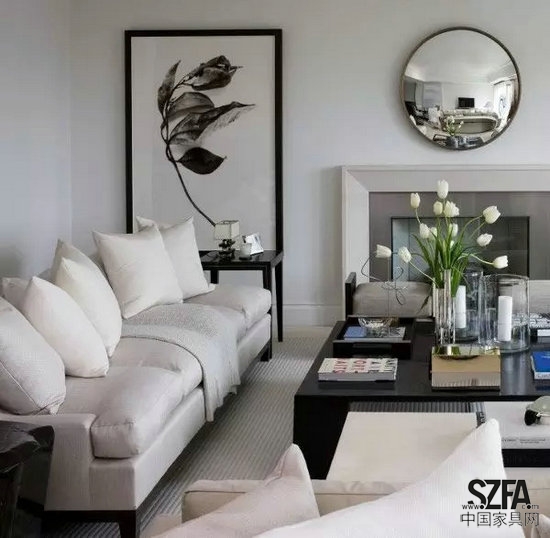不適合做門窗的布局,可使用裝飾畫、地毯等突出方格式設(shè)計(jì),而圓形的月洞門則巧妙地化為了鏡子。