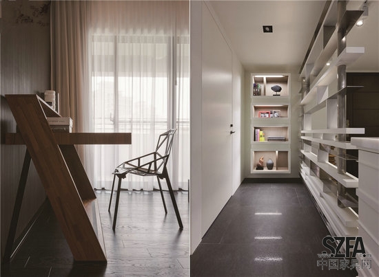 設計團隊為這間單元住宅的中央打造出一處富有“茶藝”氛圍的品茶區(qū),極具藝術(shù)感,在這里,居住者可以一邊品茶,一邊欣賞室內(nèi)各空間的裝潢景致,同時,也為觀賞未來的公園綠化景致提供了最為理想的視角;此外,它也實現(xiàn)了室內(nèi)與戶外視覺的自然過渡,是宅內(nèi)一處適合于放松、社交、互動和休息的區(qū)域。品茶區(qū)空間以木質(zhì)材料裝潢,其藝術(shù)視覺觀感強于宅內(nèi)的其他各處,同時也賦予這間現(xiàn)代單元住宅以些許寧謐的自然之感。同樣質(zhì)地的木材紋路還被用于壁紙的裝飾中,而染色玻璃墻體和相應的軟質(zhì)材料則都有著良好的光滑度,以保持室內(nèi)裝飾紋理的視覺平衡。