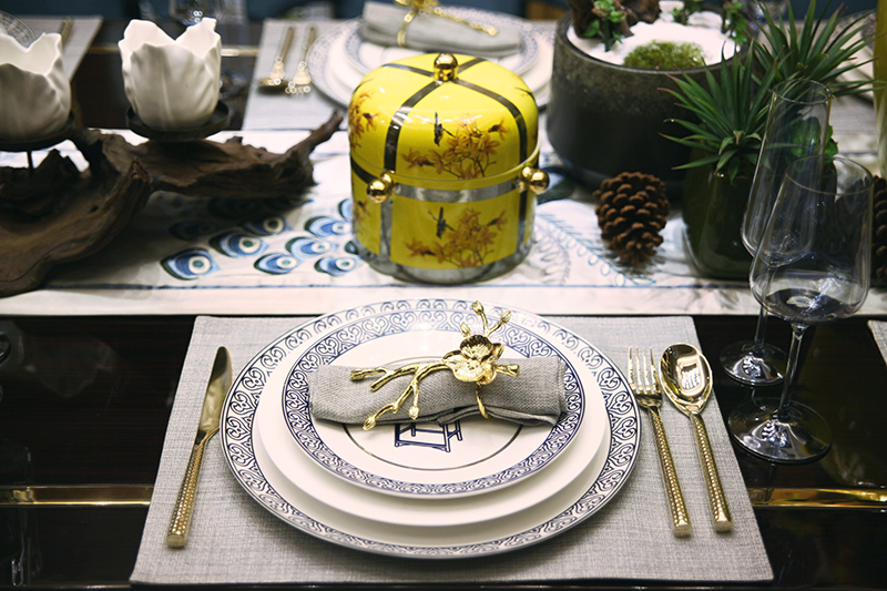 餐廳延續(xù)了客廳湖藍(lán)與亮黃的色彩搭配,白底青花圖案的餐盤(pán)與金色的餐具搭配,樸實(shí)的東方情懷中透露著奢華與貴氣,桌上的小綠植和木雕松果,讓這樣一個(gè)略顯秩序感的就餐環(huán)境,多了幾分輕松與親切。餐廳入口處的兩個(gè)立柜,后面的壁柜構(gòu)成造景框,加上各種陶瓷及藝術(shù)品擺件,無(wú)疑是中式元素的最好代表。