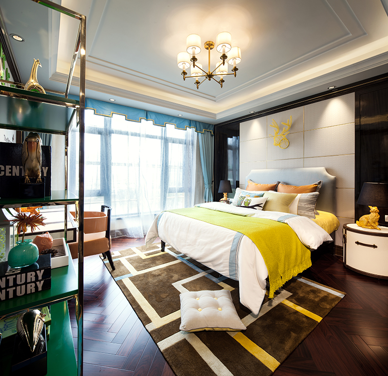 在二樓的空間,設(shè)置有主人房、書(shū)房、小會(huì)議廳、健身室、棋牌室、客房等空間。而設(shè)計(jì)師順應(yīng)了別墅主人西式的生活習(xí)慣,并又熱愛(ài)中式傳統(tǒng)文化的信仰,采用簡(jiǎn)歐風(fēng)格大床搭配具有弧形線條的沙發(fā)和簡(jiǎn)約的柜子,配上祥云的掛畫(huà)、陶瓷擺件、水墨山畫(huà)地毯表達(dá)出主人享受現(xiàn)代生活的樂(lè)趣的同時(shí)也追求傳統(tǒng)文化??头吭O(shè)計(jì)關(guān)照居者對(duì)生活廣而大的需求,以歐式簡(jiǎn)約與現(xiàn)代中式的風(fēng)格為基礎(chǔ)環(huán)境,利用床上用品、掛件、柜地毯的色彩來(lái)實(shí)現(xiàn)不同區(qū)域的區(qū)分,呈現(xiàn)空間豐沛的美學(xué)力量。