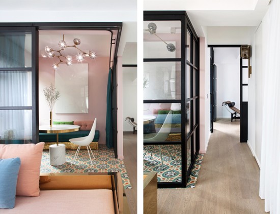The aesthetic is clean, fresh, and sophisticated. Though evocative of a loft’s spatial continuity, Lim + Lu aimed to avoid any association with the now ubiquitous New York industrial style. Moving away from the ubiquity of industrial-"chic", the pair deliberately chose hues that would inject fresh life into the space. The walls of the living room and bedroom are painted white with black accents, signaling spaces of rest and relaxation. Meanwhile, the kitchen, study, walk-in closet and master bathroom are host to rich pastels and dark jeweled tones, tastefully combined with patterned ceramic tiles to juxtapose the core living space with the extensions. The thresholds created by the subtle distinctions of color, texture and material maintain a fluidity to allow the space to blend effortlessly together as one.