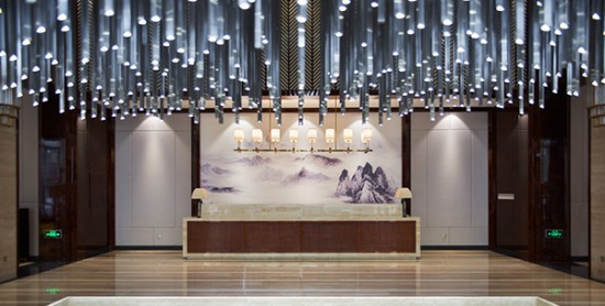 營銷中心由大堂區(qū)、沙盤區(qū)、洽談區(qū)、水吧區(qū)、景觀休閑區(qū)、兒童游樂區(qū)、VIP區(qū)、咖啡廳等主要功能區(qū)域組成,多種功能空間組合模式營造了豐富的場所體驗感。進入大堂中心,便被一個奪人眼目的裝置藝術(shù)吸引,數(shù)百根不銹鋼條垂吊而下,宛如瀑布“飛流直下三千尺,疑是銀河落九天”,成為整個空間的視覺焦點,啟動后,水珠從不銹鋼滴落到地景的水中,呈現(xiàn)出“大珠小珠落玉盤”的動感。